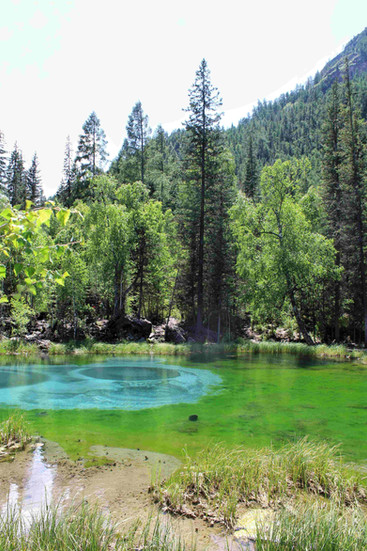 Zoals ik al noemde, waren we op weg naar het Geisermeer. Dit meer ligt in de buurt van Aktash en is een inmiddels bekende trekpleister in het Altai gebied. We snappen wel waarom. Het meer is, zoals veel meren hier, azuurblauw. Dat is op zich al mooi, maar in het meer bevinden zich geisers. Ze spuiten niet boven het water uit, maar zorgen voor unieke, bewegende cirkels van klei en slib onder water, waardoor het bijna lijkt alsof er inktvlekken in het meer drijven. Een uitzonderlijk gezicht, wat we nog nooit eerder zo hebben gezien. Ondanks het toerisme, was het zeker een bezoekje waard.
