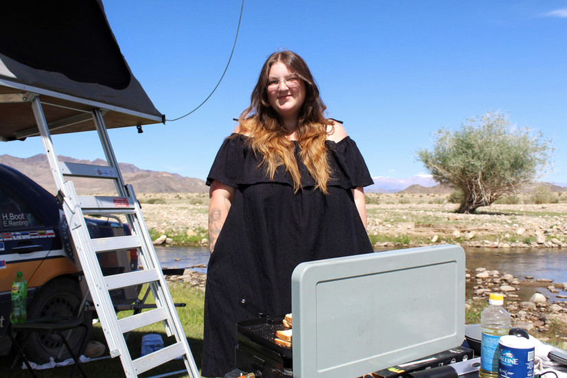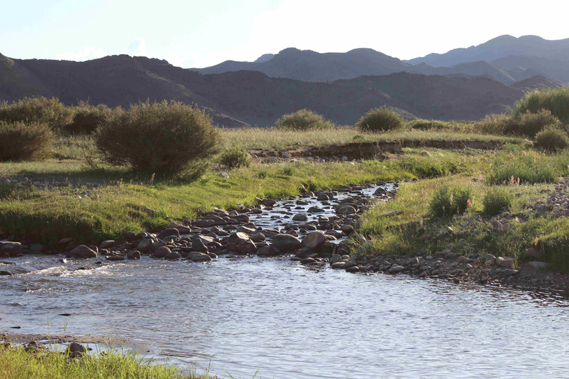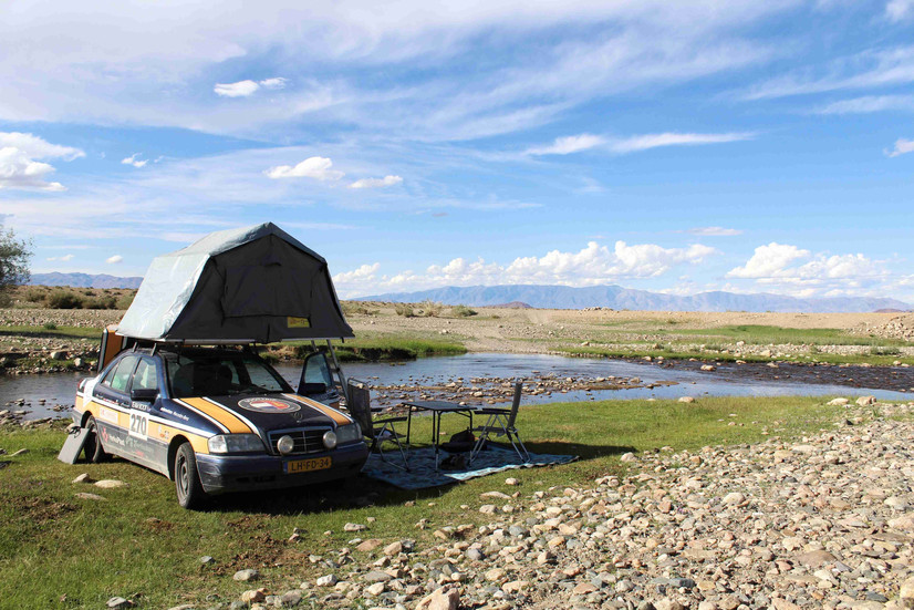 Omdat het ons zonde leek om te wachten tot we een autoverzekering zouden kunnen afsluiten, besloten we maar gewoon op hoop van zegen verder te rijden. Zo hoog zijn boetes hier nou ook weer niet. Uitgerust met genoeg eten en water trokken we richting het punt waarop we de Gobi in zouden gaan. Dit duurde een paar dagen, waarvan we een nacht kampeerden op een betoverende plek. Ver van de snelweg, over een vaag zandweggetje reden we het plekje tegemoet. Een riviertje stroomde zachtjes langs een mooi stuk grasveld, omgeven door niks anders dan natuur. De doorgaande weg was al lang niet meer te zien en het geluid dat er was kwam vooral van de enorme cicadas die af en toe langs zoefden. Het was er zo mooi, dat we besloten er twee nachten te staan. We hadden genoeg rantsoen en van dit soort plekjes hoor je te genieten.