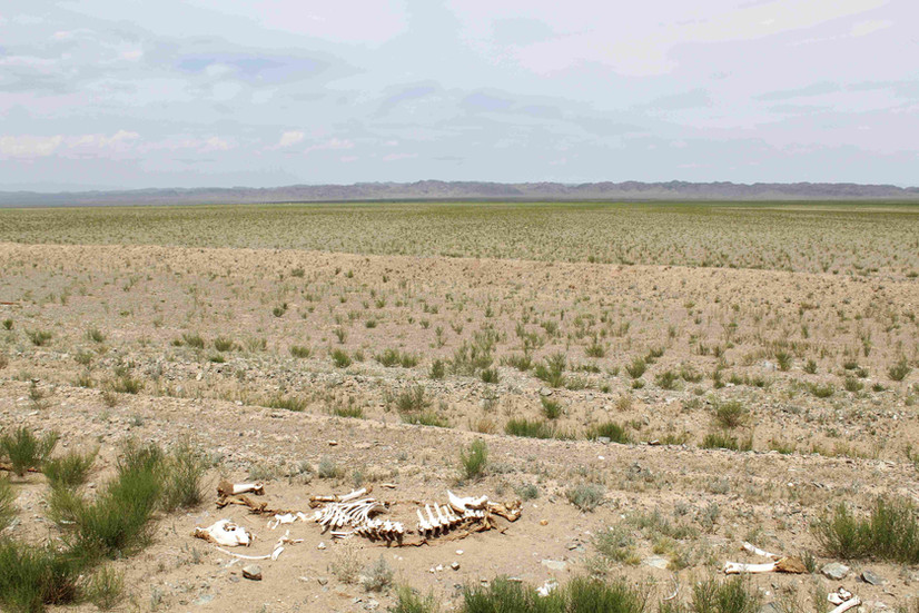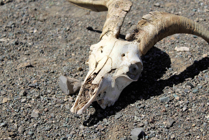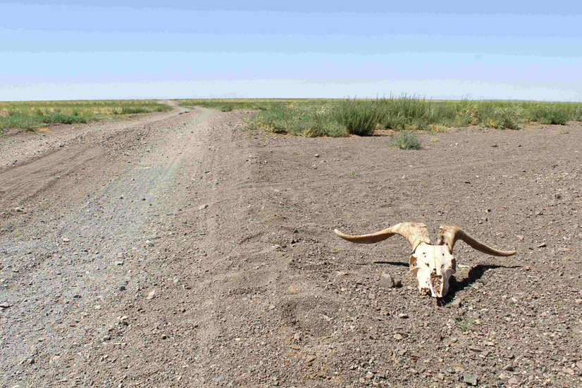 Eindelijk was het dan zo ver. Tijd om de Gobi te bezoeken. Het plan was om van Dalanzadgad de Gobi in te rijden, om daar in een van de vele yurtcamps te slapen. Dan konden we de volgende dag de Gobi verder ontdekken om vervolgens weer naar Dalanzadgad terug te keren. We gingen op weg. Bij het dorp Bayandalai stonden we voor een keuze. Er waren twee afslagen. Een ervan leek alleen begaanbaar met een 4x4, de ander had een nieuw aangelegde asfaltweg. Eén en één is twee lijkt me. We namen de nieuwe weg, die we een uur of twee volgden voor we toch echt de weg af moesten. Het volgende stuk was een aantal kilometer off road. Hoe dichter we bij de duinen kwamen, hoe lastiger de weg werd. Herman moest over een aantal flinke keien en links en rechts van ons kwamen we regelmatig botten tegen van dieren. Op een bepaald punt vonden we zelfs een volledig paarden- of koeienskelet langs de weg! Grimmig, maar wel vet.